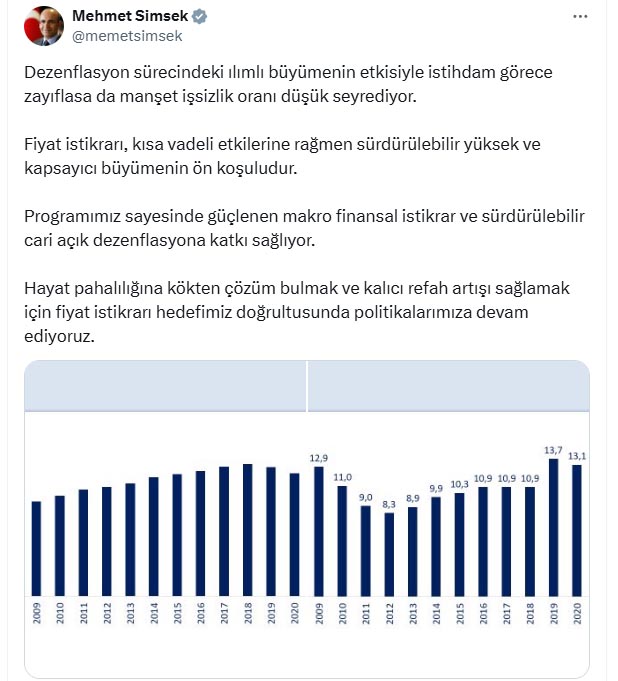 Bakan Şimşek, sosyal medya hesabından işsizlik verilerine ilişkin yaptığı açıklamada, “Dezenflasyon sürecindeki ılımlı büyümenin etkisiyle istihdam görece zayıflasa da manşet işsizlik oranı düşük seyrediyor. Fiyat istikrarı, kısa vadeli etkilerine rağmen sürdürülebilir yüksek ve kapsayıcı büyümenin ön koşuludur. Programımız sayesinde güçlenen makro finansal istikrar ve sürdürülebilir cari açık dezenflasyona katkı sağlıyor. Hayat pahalılığına kökten çözüm bulmak ve kalıcı refah artışı sağlamak için fiyat istikrarı hedefimiz doğrultusunda politikalarımıza devam ediyoruz” ifadelerini kullandı.