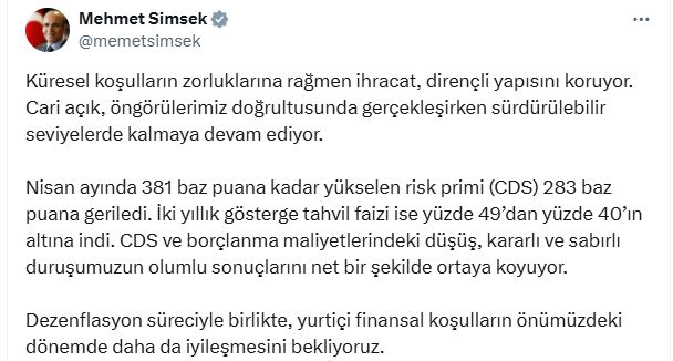 Hazine ve Maliye Bakanı Mehmet Şimşek, sosyal medya hesabından yaptığı açıklamada, “Küresel koşulların zorluklarına rağmen ihracat, dirençli yapısını koruyor. Cari açık, öngörülerimiz doğrultusunda gerçekleşirken sürdürülebilir seviyelerde kalmaya devam ediyor. Nisan ayında 381 baz puana kadar yükselen risk primi (CDS), 283 baz puana geriledi. İki yıllık gösterge tahvil faizi ise yüzde 49dan yüzde 40ın altına indi. CDS ve borçlanma maliyetlerindeki düşüş, kararlı ve sabırlı duruşumuzun olumlu sonuçlarını net bir şekilde ortaya koyuyor. Dezenflasyon süreciyle birlikte, yurt içi finansal koşulların önümüzdeki dönemde daha da iyileşmesini bekliyoruz” ifadelerini kullandı.