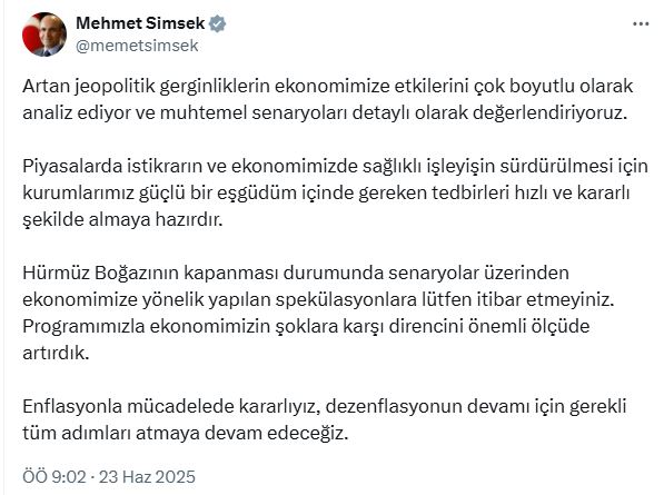 Hazine ve Maliye Bakanı Mehmet Şimşek, soysal medya hesabından yaptığı açıklamada, “Artan jeopolitik gerginliklerin ekonomimize etkilerini çok boyutlu olarak analiz ediyor ve muhtemel senaryoları detaylı olarak değerlendiriyoruz. Piyasalarda istikrarın ve ekonomimizde sağlıklı işleyişin sürdürülmesi için kurumlarımız güçlü bir eş güdüm içinde gereken tedbirleri hızlı ve kararlı şekilde almaya hazırdır. Hürmüz Boğazının kapanması durumunda senaryolar üzerinden ekonomimize yönelik yapılan spekülasyonlara lütfen itibar etmeyiniz. Programımızla ekonomimizin şoklara karşı direncini önemli ölçüde artırdık. Enflasyonla mücadelede kararlıyız, dezenflasyonun devamı için gerekli tüm adımları atmaya devam edeceğiz” ifadelerini kullandı.