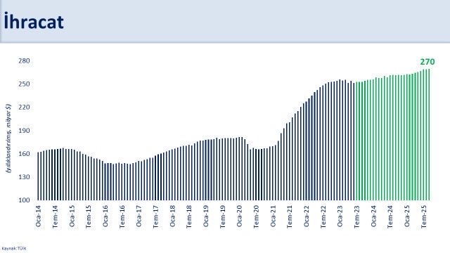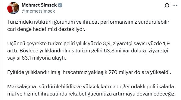 Hazine ve Maliye Bakanı Mehmet Şimşek, turizm ve dış ticaret istatistiklerine ilişkin sosyal medya hesabından açıklama yaptı. Bakan Şimşek, “Turizmdeki istikrarlı görünüm ve ihracat performansımız sürdürülebilir cari denge hedefimizi destekliyor. Üçüncü çeyrekte turizm geliri yıllık yüzde 3,9, ziyaretçi sayısı yüzde 1,9 arttı. Böylece yıllıklandırılmış turizm geliri 63,8 milyar dolara, ziyaretçi sayısı 63,1 milyona ulaştı. Eylülde yıllıklandırılmış ihracatımız yaklaşık 270 milyar dolara yükseldi. Markalaşma, sürdürülebilirlik ve yüksek katma değer odaklı politikalarla mal ve hizmet ihracatında rekabet gücümüzü artırmaya devam edeceğiz” dedi.