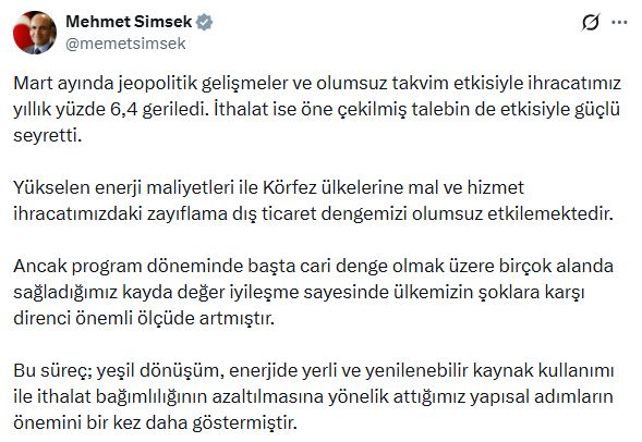Hazine ve Maliye Bakanı Mehmet Şimşek, dış ticaret verilerine ilişkin sanal medya hesabından açıklama yaptı. Bakan Şimşek, “Mart ayında jeopolitik gelişmeler ve olumsuz takvim etkisiyle ihracatımız yıllık yüzde 6,4 geriledi. İthalat ise öne çekilmiş talebin de etkisiyle güçlü seyretti. Yükselen enerji maliyetleri ile Körfez ülkelerine mal ve hizmet ihracatımızdaki zayıflama dış ticaret dengemizi olumsuz etkilemektedir. Ancak program döneminde başta cari denge olmak üzere birçok alanda sağladığımız kayda değer iyileşme sayesinde ülkemizin şoklara karşı direnci önemli ölçüde artmıştır. Bu süreç; yeşil dönüşüm, enerjide yerli ve yenilenebilir kaynak kullanımı ile ithalat bağımlılığının azaltılmasına yönelik attığımız yapısal adımların önemini bir kez daha göstermiştir” ifadelerini kullandı.