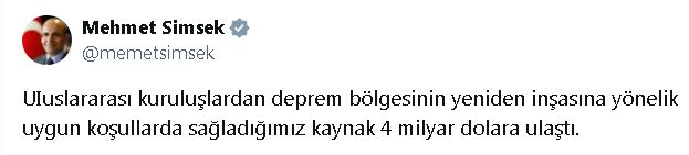 Bakan Şimşek, sosyal medya hesabından yaptığı açıklamada, “UIuslararası kuruluşlardan deprem bölgesinin yeniden inşasına yönelik uygun koşullarda sağladığımız kaynak 4 milyar dolara ulaştı” dedi.