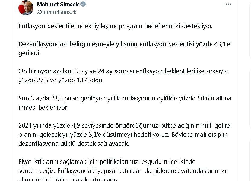 Bakan Şimşek, piyasa katılımcıları anketi verilerine ilişkin sosyal medya hesabından yaptığı açıklamada, “Enflasyon beklentilerindeki iyileşme program hedeflerimizi destekliyor. Dezenflasyondaki belirginleşmeyle yıl sonu enflasyon beklentisi yüzde 43,1e geriledi. 11 aydır azalan 12 ay ve 24 ay sonrası enflasyon beklentileri ise sırasıyla yüzde 27,5 ve yüzde 18,4 oldu. Son 3 ayda 23,5 puan gerileyen yıllık enflasyonun, eylülde yüzde 50nin altına inmesi bekleniyor” ifadelerini kullandı.