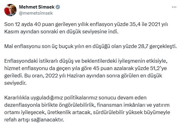 Bakan Şimşek: Yıllık enflasyon, 2021 yılı Kasım ayından sonraki en düşük seviyesine indi