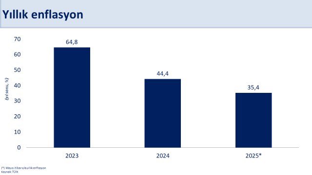 Hazine ve Maliye Bakanı Mehmet Şimşek, mayıs ayı enflasyon verilerine ilişkin sosyal medya hesabından açıklama yaptı. Bakan Şimşek, “Son 12 ayda 40 puan gerileyen yıllık enflasyon yüzde 35,4 ile 2021 yılı Kasım ayından sonraki en düşük seviyesine indi. Mal enflasyonu son 3,5 yılın en düşüğü olan yüzde 28,7 gerçekleşti. Enflasyondaki istikrarlı düşüş ve beklentilerdeki iyileşmenin etkisiyle, hizmet enflasyonu da geçen yıla göre 45 puan azalarak yüzde 51,2ye geriledi. Bu oran, 2022 yılı Haziran ayından sonra görülen en düşük seviyedir. Kararlılıkla uyguladığımız politikalarımız sonucu devam eden dezenflasyonla birlikte öngörülebilirlik, finansman imkanları ve yatırım ortamı iyileşecek, üretkenlik artacak, sürdürülebilir yüksek büyümeyle refah artışı sağlanacaktır” dedi.