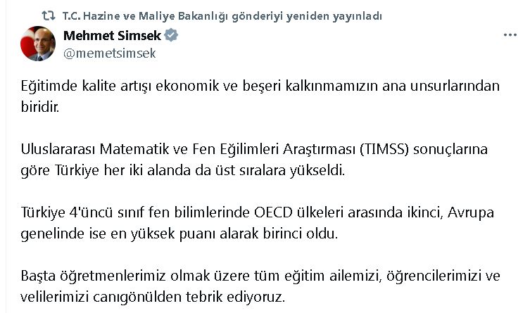 Hazine ve Maliye Bakanı Mehmet Şimşek, Milli Eğitim Bakanlığının duyurduğu TIMSS 2023 sonuçlarına ilişkin sosyal medya hesabından yaptığı açıklamada, “Eğitimde kalite artışı ekonomik ve beşeri kalkınmamızın ana unsurlarından biridir. Uluslararası Matematik ve Fen Eğilimleri Araştırması (TIMSS) sonuçlarına göre Türkiye her 2 alanda da üst sıralara yükseldi. Türkiye 4üncü sınıf fen bilimlerinde OECD ülkeleri arasında 2nci, Avrupa genelinde ise en yüksek puanı alarak 1inci oldu. Başta öğretmenlerimiz olmak üzere tüm eğitim ailemizi, öğrencilerimizi ve velilerimizi canıgönülden tebrik ediyoruz” ifadelerini kullandı.