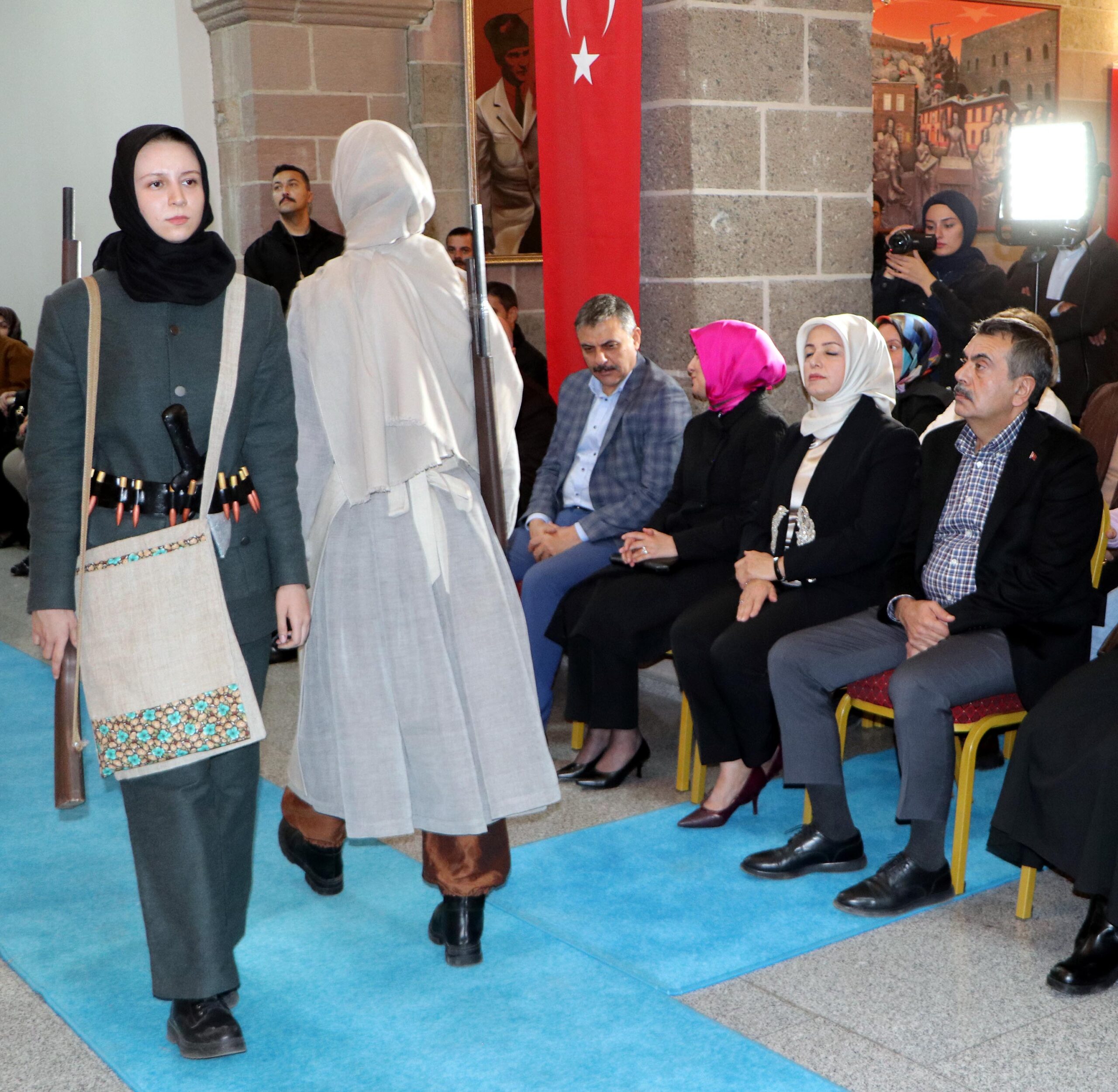 Dün akşam Erzuruma gelen Millî Eğitim Bakanı Yusuf Tekin bugün partisinin İspir ve Pazaryolu ilçelerinde düzenlenen 8inci Olağan Kongrelerine katıldı. Bakan Yusuf Tekin, daha sonra cumhuriyetin temellerinin atıldığı Erzurum Kongre Binasında Milli Eğitim Bakanlığının Hayat Boyu Öğrenme Genel Müdürlüğüne bağlı Olgunlaşma Enstitülerinin bugüne dek üretilen koleksiyonlarından hazırlanan ‘Payidar’ isimli defileyi izledi. Genç kız ve erkeklerin sergilediği defilede kahraman kadınların giyindiği kıyafetler ve Atatürkün kostümleri yer aldı.
