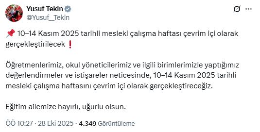Bakan Tekin, sosyal medya hesabından yaptığı açıklamada, “Öğretmenlerimiz, okul yöneticilerimiz ve ilgili birimlerimizle yaptığımız değerlendirmeler ve istişareler neticesinde, 10-14 Kasım 2025 tarihli mesleki çalışma haftasını çevrim içi olarak gerçekleştireceğiz. Eğitim ailemize hayırlı, uğurlu olsun” dedi.