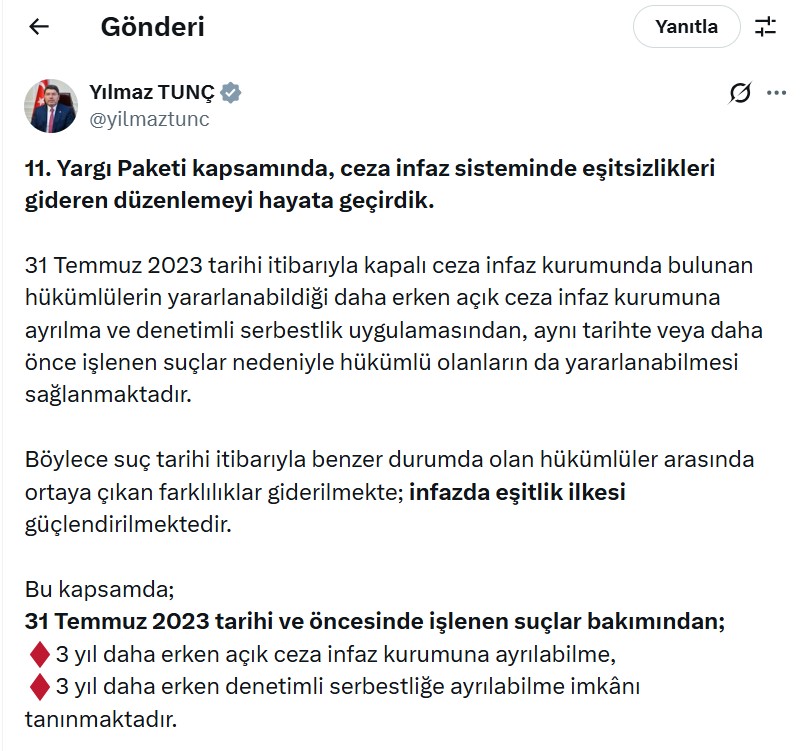 Adalet Bakanı Yılmaz Tunç, sanal medya hesabından yaptığı açıklamada, “11inci Yargı Paketi kapsamında, ceza infaz sisteminde eşitsizlikleri gideren düzenlemeyi hayata geçirdik. 31 Temmuz 2023 tarihi itibarıyla kapalı ceza infaz kurumunda bulunan hükümlülerin yararlanabildiği daha erken açık ceza infaz kurumuna ayrılma ve denetimli serbestlik uygulamasından, aynı tarihte veya daha önce işlenen suçlar nedeniyle hükümlü olanların da yararlanabilmesi sağlanmaktadır. Böylece suç tarihi itibarıyla benzer durumda olan hükümlüler arasında ortaya çıkan farklılıklar giderilmekte; infazda eşitlik ilkesi güçlendirilmektedir. Bu kapsamda; 31 Temmuz 2023 tarihi ve öncesinde işlenen suçlar bakımından; 3 yıl daha erken açık ceza infaz kurumuna ayrılabilme, 3 yıl daha erken denetimli serbestliğe ayrılabilme imkanı tanınmaktadır” ifadelerini kullandı.