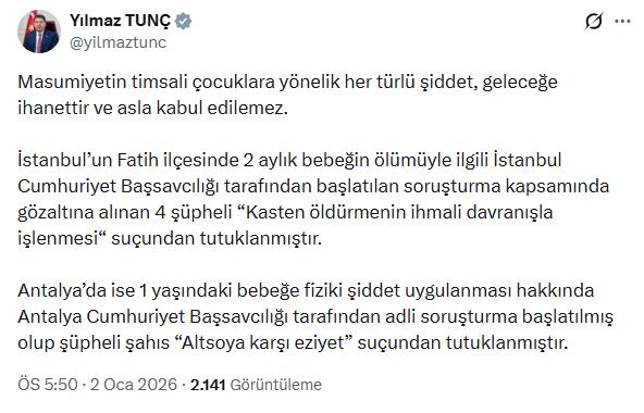 Bakan Tunç, sanal medya hesabından yaptığı açıklamada, “Masumiyetin timsali çocuklara yönelik her türlü şiddet, geleceğe ihanettir ve asla kabul edilemez. İstanbulun Fatih ilçesinde 2 aylık bebeğin ölümüyle ilgili İstanbul Cumhuriyet Başsavcılığı tarafından başlatılan soruşturma kapsamında gözaltına alınan 4 şüpheli, Kasten öldürmenin ihmali davranışla işlenmesi suçundan tutuklanmıştır. Antalyada ise 1 yaşındaki bebeğe fiziki şiddet uygulanması hakkında Antalya Cumhuriyet Başsavcılığı tarafından adli soruşturma başlatılmış olup şüpheli şahıs Altsoya karşı eziyet suçundan tutuklanmıştır” ifadelerini kullandı.