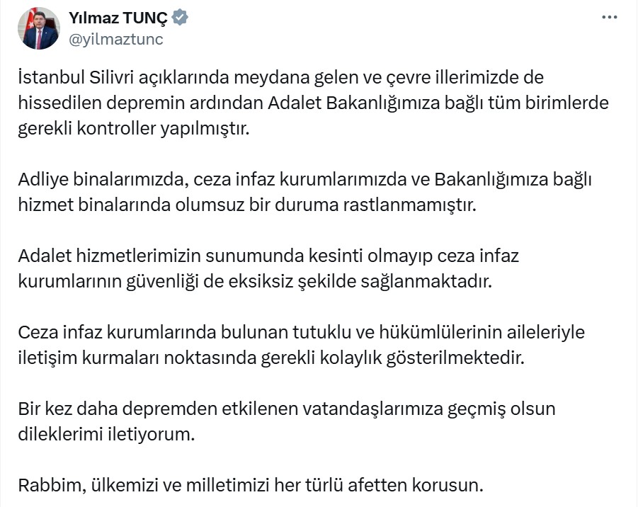 Bakan Tunç, sosyal medya hesabından yaptığı açıklamada, “İstanbul Silivri açıklarında meydana gelen ve çevre illerimizde de hissedilen depremin ardından Adalet Bakanlığımıza bağlı tüm birimlerde gerekli kontroller yapılmıştır. Adliye binalarımızda, ceza infaz kurumlarımızda ve Bakanlığımıza bağlı hizmet binalarında olumsuz bir duruma rastlanmamıştır” dedi.