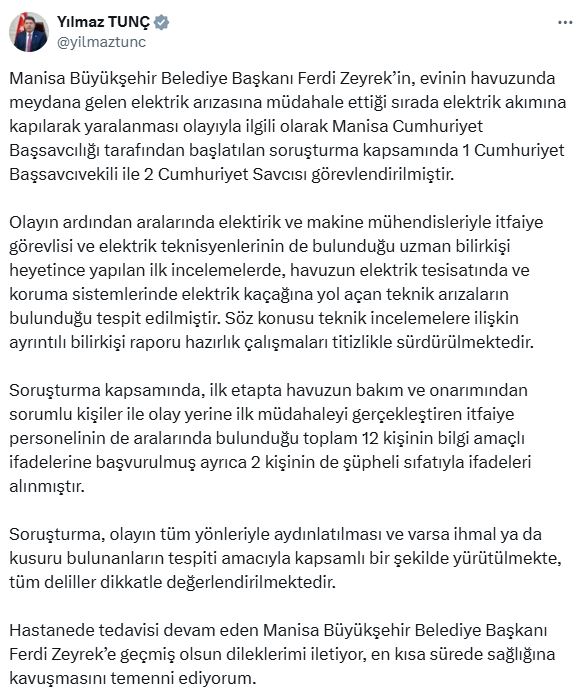 Bakan Tunç, sosyal medya hesabından yaptığı açıklamada, “Manisa Büyükşehir Belediye Başkanı Ferdi Zeyrek’in, evinin havuzunda meydana gelen elektrik arızasına müdahale ettiği sırada elektrik akımına kapılarak yaralanması olayıyla ilgili olarak Manisa Cumhuriyet Başsavcılığı tarafından başlatılan soruşturma kapsamında 1 cumhuriyet başsavcıvekili ile 2 cumhuriyet savcısı görevlendirilmiştir. Olayın ardından aralarında elektrik ve makine mühendisleriyle itfaiye görevlisi ve elektrik teknisyenlerinin de bulunduğu uzman bilirkişi heyetince yapılan ilk incelemelerde, havuzun elektrik tesisatında ve koruma sistemlerinde elektrik kaçağına yol açan teknik arızaların bulunduğu tespit edilmiştir” dedi.