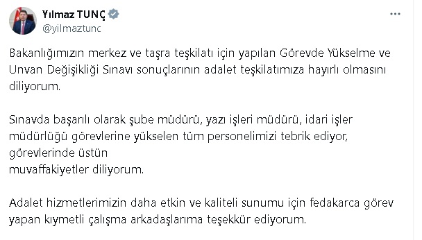 ADALET Bakanı Yılmaz Tunç, merkez ve taşra teşkilatı için yapılan Görevde Yükselme ve Unvan Değişikliği Sınavı sonuçlarının adalet teşkilatlarına hayırlı olması temennisinde bulundu.Adalet Bakanı Tunç, sosyal medya hesabından yaptığı yazılı açıklamada, “Bakanlığımızın merkez ve taşra teşkilatı için yapılan Görevde Yükselme ve Unvan Değişikliği Sınavı sonuçlarının adalet teşkilatımıza hayırlı olmasını diliyorum. Sınavda başarılı olarak şube müdürü, yazı işleri müdürü, idari işler müdürlüğü görevlerine yükselen tüm personelimizi tebrik ediyor, görevlerinde üstün muvaffakiyetler diliyorum. Adalet hizmetlerimizin daha etkin ve kaliteli sunumu için fedakarca görev yapan kıymetli çalışma arkadaşlarıma teşekkür ediyorum” dedi.