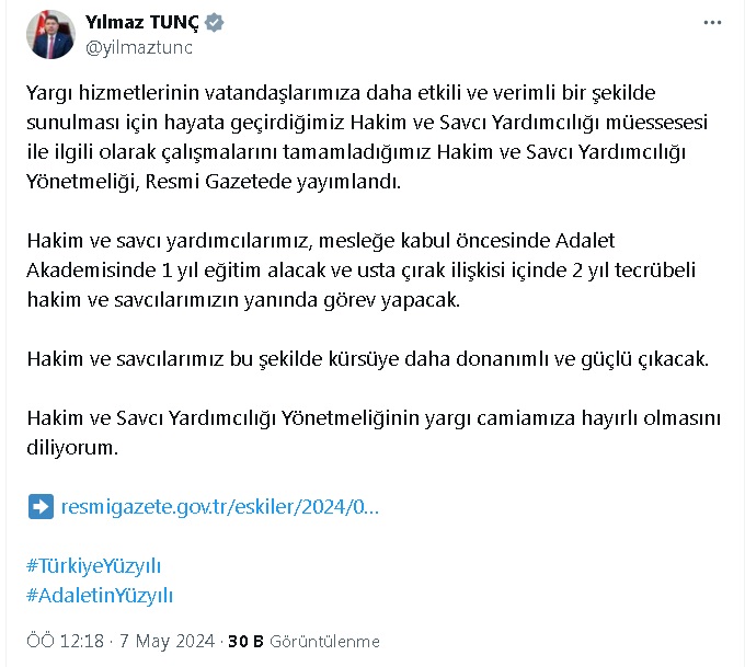 Adalet Bakanı Yılmaz Tunç, sosyal medya hesabından yaptığı paylaşımda, “Yargı hizmetlerinin vatandaşlarımıza daha etkili ve verimli bir şekilde sunulması için hayata geçirdiğimiz Hakim ve Savcı Yardımcılığı müessesesi ile ilgili olarak çalışmalarını tamamladığımız Hakim ve Savcı Yardımcılığı Yönetmeliği, Resmi Gazetede yayımlandı. Hakim ve savcı yardımcılarımız, mesleğe kabul öncesinde Adalet Akademisinde 1 yıl eğitim alacak ve usta çırak ilişkisi içinde 2 yıl tecrübeli hakim ve savcılarımızın yanında görev yapacak. Hakim ve savcılarımız bu şekilde kürsüye daha donanımlı ve güçlü çıkacak. Hakim ve Savcı Yardımcılığı Yönetmeliğinin yargı camiamıza hayırlı olmasını diliyorum” ifadelerini kullandı.
