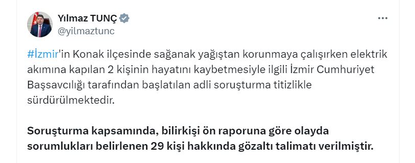 Bakan Tunç, sosyal medya hesabından yapılan açıklamada, “İzmirin Konak ilçesinde sağanak yağıştan korunmaya çalışırken elektrik akımına kapılan 2 kişinin hayatını kaybetmesiyle ilgili İzmir Cumhuriyet Başsavcılığı tarafından başlatılan adli soruşturma titizlikle sürdürülmektedir. Soruşturma kapsamında, bilirkişi ön raporuna göre olayda sorumlukları belirlenen 29 kişi hakkında gözaltı talimatı verilmiştir” dedi.
