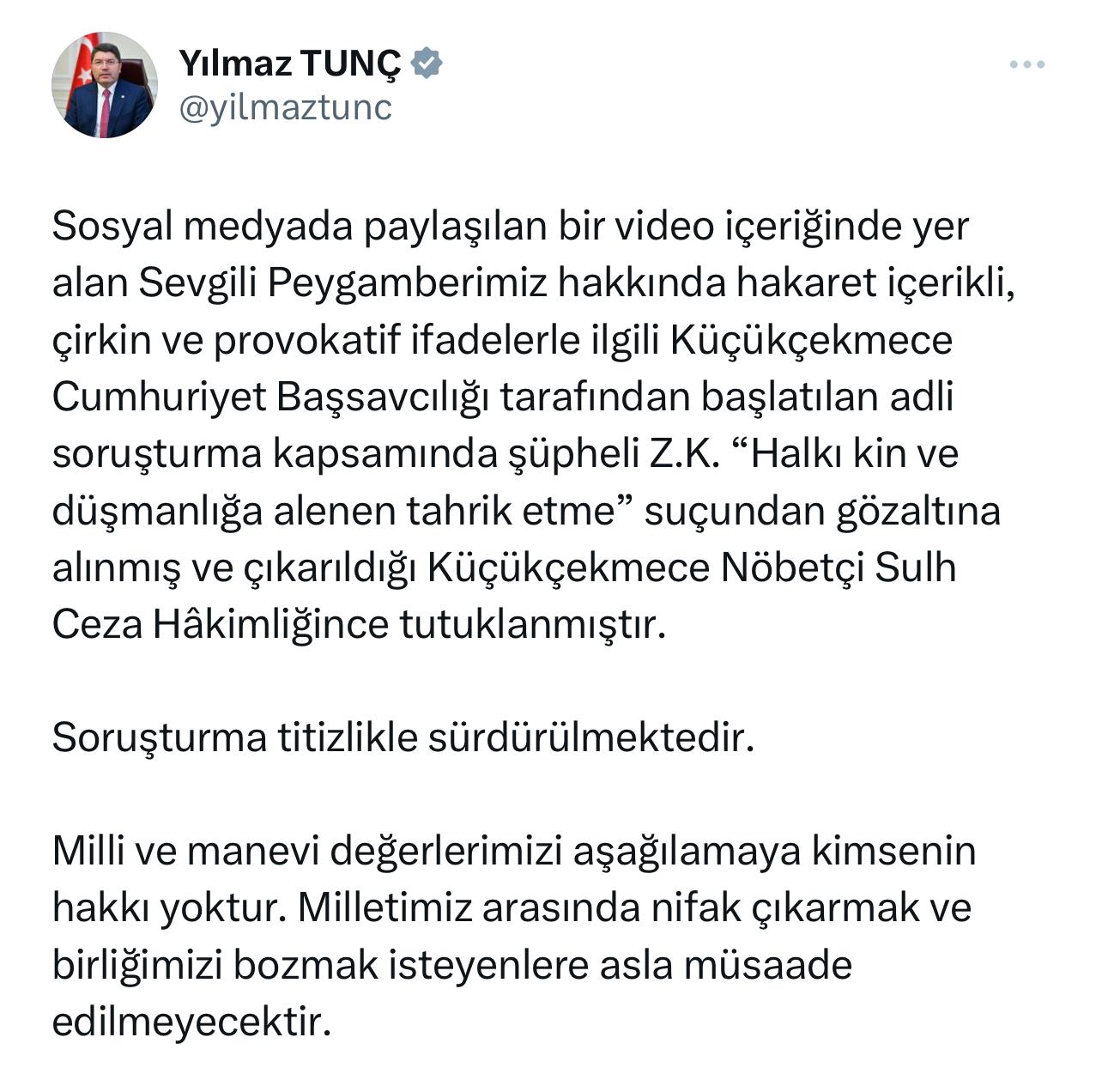 Bakan Tunç, sosyal medya hesabından açıklama yaptı. Tunç, “Sosyal medyada paylaşılan bir video içeriğinde yer alan Sevgili Peygamberimiz hakkında hakaret içerikli, çirkin ve provokatif ifadelerle ilgili Küçükçekmece Cumhuriyet Başsavcılığı tarafından başlatılan adli soruşturma kapsamında şüpheli Z.K. Halkı kin ve düşmanlığa alenen tahrik etme suçundan gözaltına alınmış ve çıkarıldığı Küçükçekmece Nöbetçi Sulh Ceza Hâkimliğince tutuklanmıştır. Soruşturma titizlikle sürdürülmektedir. Milli ve manevi değerlerimizi aşağılamaya kimsenin hakkı yoktur. Milletimiz arasında nifak çıkarmak ve birliğimizi bozmak isteyenlere asla müsaade edilmeyecektir” ifadelerini kullandı.