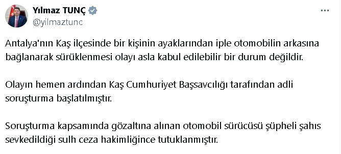 Bakan Tunç, sosyal medya hesabından yaptığı paylaşımda, “Antalyanın Kaş ilçesinde bir kişinin ayaklarından iple otomobilin arkasına bağlanarak sürüklenmesi olayı asla kabul edilebilir bir durum değildir. Olayın hemen ardından Kaş Cumhuriyet Başsavcılığı tarafından adli soruşturma başlatılmıştır. Soruşturma kapsamında gözaltına alınan otomobil sürücüsü şüpheli şahıs sevk edildiği sulh ceza hakimliğince tutuklanmıştır” ifadelerini kullandı.