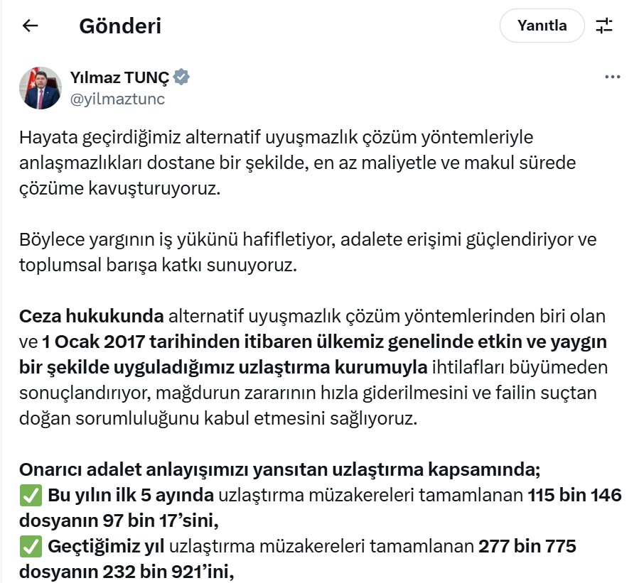 Adalet Bakanı Yılmaz Tunç, sosyal medya hesabından yaptığı açıklamada, “Hayata geçirdiğimiz alternatif uyuşmazlık çözüm yöntemleriyle anlaşmazlıkları dostane bir şekilde, en az maliyetle ve makul sürede çözüme kavuşturuyoruz. Böylece yargının iş yükünü hafifletiyor, adalete erişimi güçlendiriyor ve toplumsal barışa katkı sunuyoruz. Ceza hukukunda alternatif uyuşmazlık çözüm yöntemlerinden biri olan ve 1 Ocak 2017 tarihinden itibaren ülkemiz genelinde etkin ve yaygın bir şekilde uyguladığımız uzlaştırma kurumuyla ihtilafları büyümeden sonuçlandırıyor, mağdurun zararının hızla giderilmesini ve failin suçtan doğan sorumluluğunu kabul etmesini sağlıyoruz” ifadelerini kullandı.