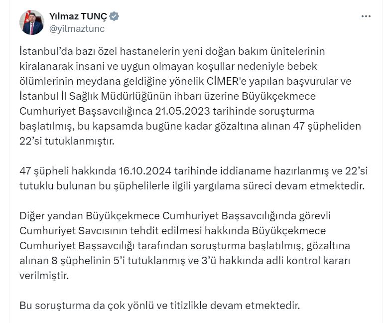 ​Bakan Tunç, sosyal medya hesabından yaptığı açıklamada, “İstanbulda bazı özel hastanelerin yeni doğan bakım ünitelerinin kiralanarak insani ve uygun olmayan koşullar nedeniyle bebek ölümlerinin meydana geldiğine yönelik CİMERe yapılan başvurular ve İstanbul İl Sağlık Müdürlüğünün ihbarı üzerine Büyükçekmece Cumhuriyet Başsavcılığınca 21 Mayıs 2023 tarihinde soruşturma başlatılmış, bu kapsamda bugüne kadar gözaltına alınan 47 şüpheliden 22si tutuklanmıştır. 47 şüpheli hakkında 16 Ekim 2024 tarihinde iddianame hazırlanmış ve 22si tutuklu bulunan bu şüphelilerle ilgili yargılama süreci devam etmektedir” dedi.