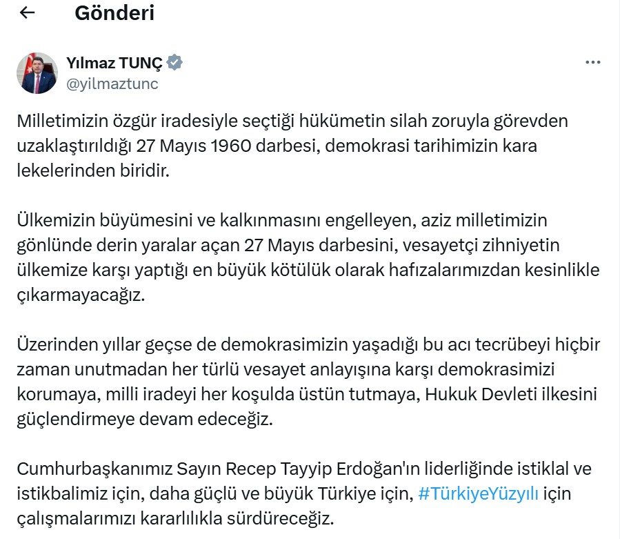 Adalet Bakanı Yılmaz Tunç, sosyal medya hesabından paylaştığı mesajda, “Milletimizin özgür iradesiyle seçtiği hükümetin silah zoruyla görevden uzaklaştırıldığı 27 Mayıs 1960 darbesi, demokrasi tarihimizin kara lekelerinden biridir. Ülkemizin büyümesini ve kalkınmasını engelleyen, aziz milletimizin gönlünde derin yaralar açan 27 Mayıs darbesini, vesayetçi zihniyetin ülkemize karşı yaptığı en büyük kötülük olarak hafızalarımızdan kesinlikle çıkarmayacağız. Üzerinden yıllar geçse de demokrasimizin yaşadığı bu acı tecrübeyi hiçbir zaman unutmadan her türlü vesayet anlayışına karşı demokrasimizi korumaya, milli iradeyi her koşulda üstün tutmaya, hukuk devleti ilkesini güçlendirmeye devam edeceğiz” dedi.