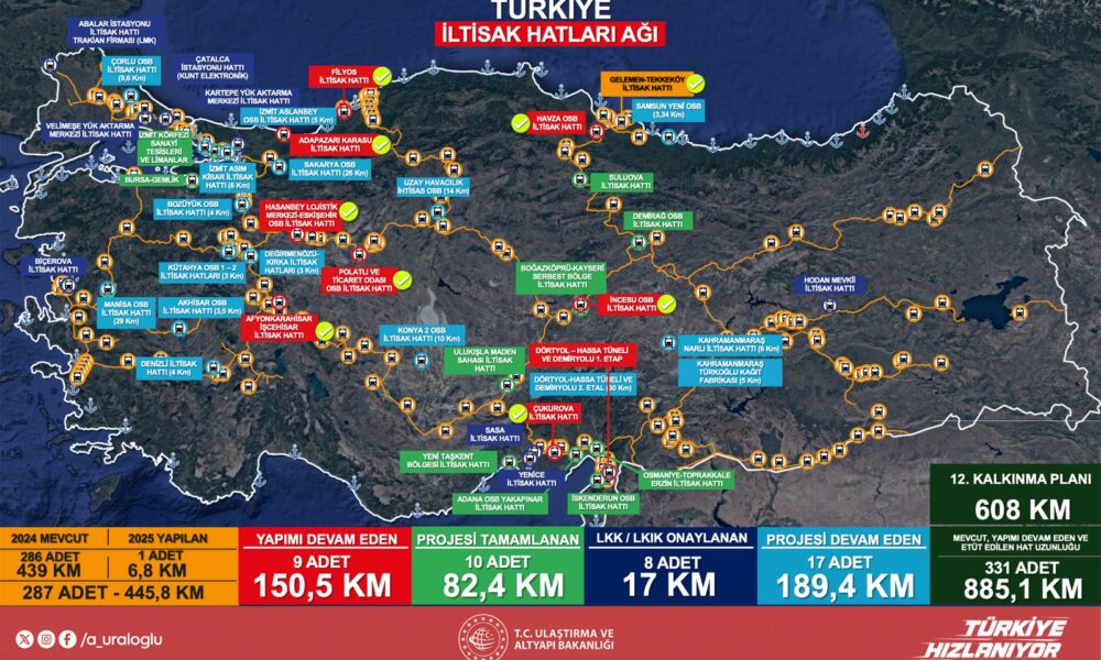 Lojistik Koordinasyon Kurulu tarafından onaylanan 17 kilometrelik 8 iltisak hattı bulunduğunu belirten Bakan Uraloğlu, 82,4 kilometrelik 10 projenin tamamlandığını, 189,4 kilometrelik 17 hat için proje çalışmalarının sürdüğünü bildirdi. Bakan Uraloğlu, açıklamasında, “Mevcut hatlarımızla birlikte yapımı devam eden ve etüt edilen tüm hatlarımız tamamlandığında 885,1 kilometre uzunluğunda 331 adet iltisak hattımız olacak. 12nci Kalkınma Planı kapsamında ise 2028 yılında iltisak hattı uzunluğunu 608 kilometreye ulaştırmayı hedefliyoruz” ifadelerini kullandı.