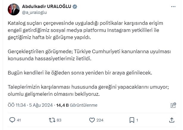 Bakan Uraloğlu, erişim engeli getirilen Instagram ile ilgili sosyal medya hesabından açıklama yaptı. Uraloğlu, “Katalog suçları çerçevesinde uyguladığı politikalar karşısında erişim engeli getirdiğimiz sosyal medya platformu Instagram yetkilileri ile geçtiğimiz hafta bir görüşme yapıldı. Gerçekleştirilen görüşmede; Türkiye Cumhuriyeti kanunlarına uyulması konusunda hassasiyetlerimiz iletildi. Bugün kendileri ile öğleden sonra yeniden bir araya gelinilecek. Taleplerimizin karşılanması hususunda gereğini yapacaklarını umuyor; olumlu gelişmelerin olmasını bekliyoruz” ifadelerini kullandı.
