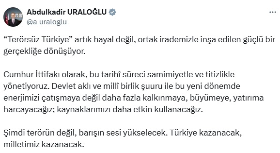 Bakan Uraloğlu, sosyal medya hesabından yaptığı açıklamada, “Terörsüz Türkiye artık hayal değil, ortak irademizle inşa edilen güçlü bir gerçekliğe dönüşüyor. Cumhur İttifakı olarak, bu tarihî süreci samimiyetle ve titizlikle yönetiyoruz. Devlet aklı ve millî birlik şuuru ile bu yeni dönemde enerjimizi çatışmaya değil daha fazla kalkınmaya, büyümeye, yatırıma harcayacağız; kaynaklarımızı daha etkin kullanacağız. Şimdi terörün değil, barışın sesi yükselecek. Türkiye kazanacak, milletimiz kazanacak” ifadelerini kullandı.