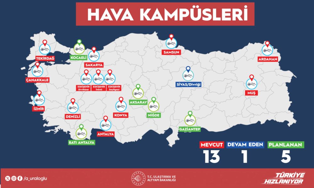 Uraloğlu, sadece helikopter inişi yapılabilen hava kampüslerin ise Muş, Denizli, İzmir Aliağa, Eskişehir Seyitgazi ile Ardahanda bulunduğunu ifade etti.
