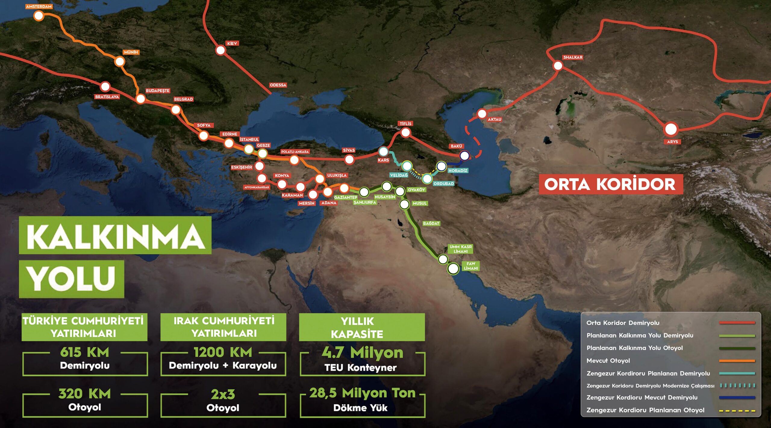 Bakan Uraloğlu, Orta Koridor’un, kuzey-güney koridorları ile de desteklenmesi gerektiğini belirterek, bu kapsamda Basra Körfezi’nden gelip Fav Limanı’ndan Bağdat üzerinden Türkiye’ye gelen, yaklaşık 2 bin 200 kilometrelik Kalkınma Yolu’ndaki çalışmalara da değindi. Uraloğlu, “Fav Limanı’nın ilk fazı 2025 yılında işletmeye açılacak. Çok büyük bir liman. Burada Çin’den deniz yoluyla gelen bir yük Fav Limanı’ndan demir yoluna aktarıldığı takdirde, artık buradan bir daha kara yoluna, deniz yoluna aktarılmadan Avrupa’nın birçok noktasına gitmiş olacak. Daha kısa sürede gitmiş olacak. Tabii bu koridorları sadece bir ticari çıkar, ticari beklentiyle de değerlendirmenin çok doğru olduğunu düşünmüyoruz. Bu koridorlarda haberleşme altyapısı yapılıyor. Ülkelerin elbette ticareti gelişiyor; ama haberleşme altyapısı da gelişiyor. Ve belki en kıymetlisi o bulundukları coğrafyaya verecekleri bir güvenlikle ilgili de garanti olacaktır. Yani o koridorlar herkes tarafından korunup kollanmaya gayret edilecektir. Ve bu Kalkınma Yolu’nun da bu anlamda ciddi katkı sağlayacağını düşünüyoruz. Zengezur Koridoru; Ermenistan ile Azerbaycan’ın yaşadığı süreç; ama şimdi sonuna gelindi. Yani böyle bir koridor onların ilişkilerine de bizim ilişkilerimize de katkı sağlayacaktır, yani güvenliğe de katkı sağlayacaktır” dedi.