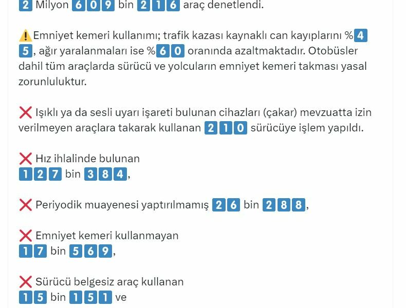 İçişleri Bakanı Ali Yerlikaya, sosyal medya hesabından yaptığı açıklamada, emniyet ve jandarma ekipleri tarafından 1-8 Ağustos tarihleri arasında 2 milyon 609 bin 216 aracın denetlendiğini belirterek, “Işıklı ya da sesli uyarı işareti bulunan cihazları (çakar) mevzuatta izin verilmeyen araçlara takarak kullanan 210 sürücüye işlem yapıldı. Hız ihlalinde bulunan 127 bin 384, periyodik muayenesi yaptırılmamış 26 bin 288, emniyet kemeri kullanmayan 17 bin 569, sürücü belgesiz araç kullanan 15 bin 151 ve zorunlu mali sorumluluk sigortası bulunmayan 9 bin 891 olmak üzere diğer işlemlerle birlikte; toplam 436 bin 589 araca/sürücüye işlem yapıldı” dedi.