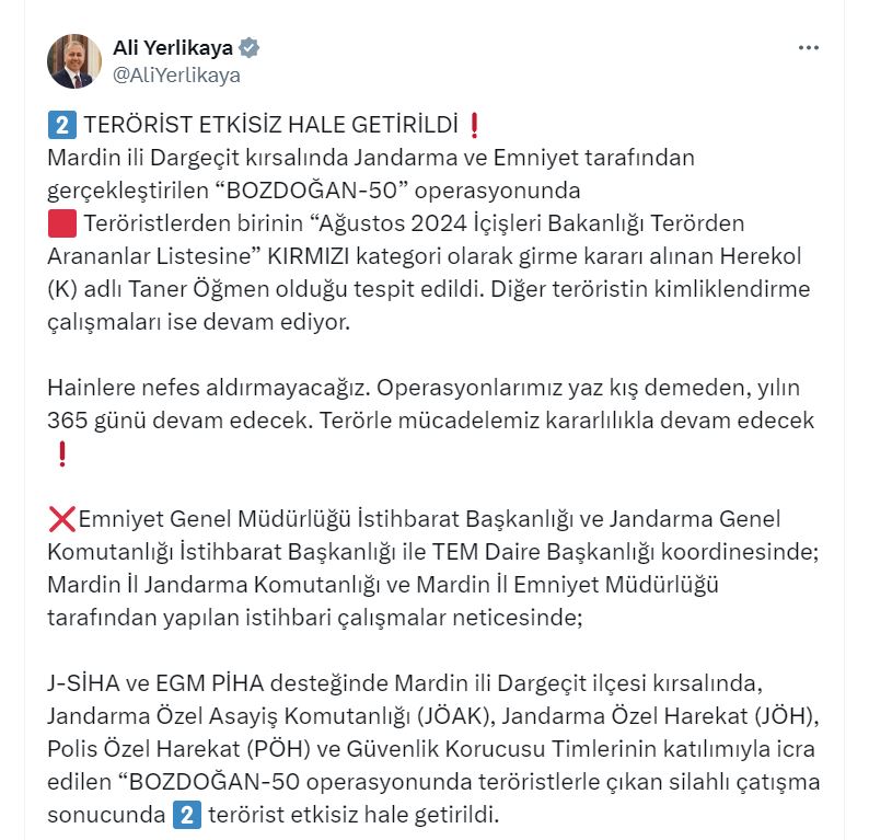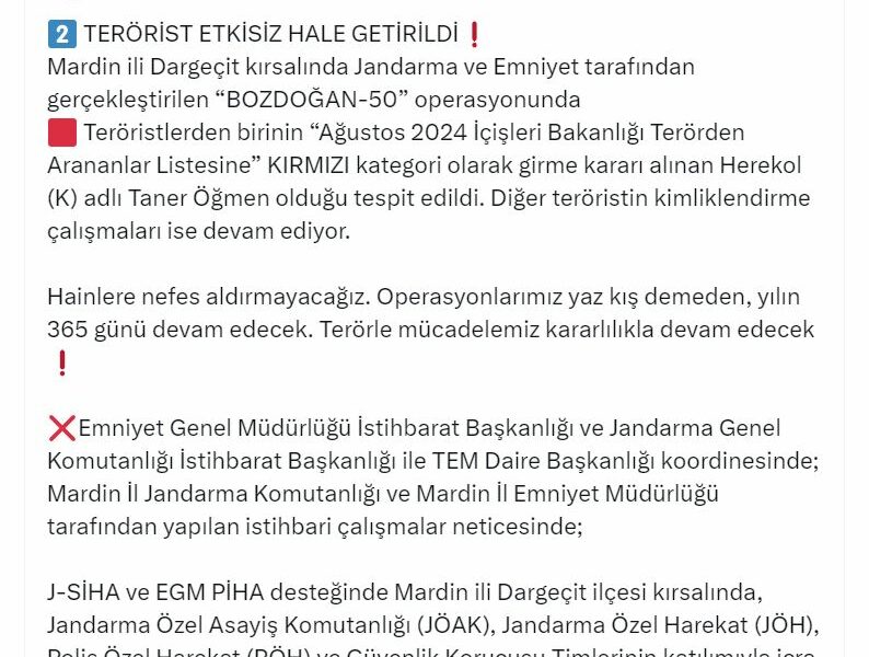 Bakan Yerlikaya, sosyal medya hesabından yaptığı açıklamada, Emniyet Genel Müdürlüğü İstihbarat Başkanlığı ve Jandarma Genel Komutanlığı İstihbarat Başkanlığı ile Terörle Mücadele Daire Başkanlığı koordinesinde; Mardin İl Jandarma Komutanlığı ve Mardin İl Emniyet Müdürlüğü tarafından Mardinin Dargeçit kırsalında Bozdoğan-50 operasyonu düzenlendiğini belirtti. Teröristlerle çıkan silahlı çatışma sonucunda 2 teröristin etkisiz hale getirildiğini kaydeden Yerlikaya, teröristlerden birinin 2009 yılında terör örgütüne katılan Herekol kod adlı Taner Öğmen olduğunu ifade etti. Öğmenin güvenlik güçlerine yönelik birçok eylemin talimatını verdiğini belirten Yerlikaya, teröristin Ağustos 2024 İçişleri Bakanlığı Terörden Arananlar Listesine kırmızı kategoriden girmesi yönünde karar alındığını ifade etti.