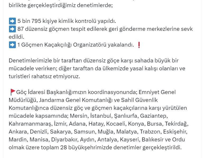 Bakan Ali Yerlikayanın sosyal medya hesabından yaptığı açıklamaya göre; Göç İdaresi Başkanlığı koordinasyonunda; Emniyet Genel Müdürlüğü, Jandarma Genel Komutanlığı ve Sahil Güvenlik Komutanlığınca düzensiz göç ve göçmen kaçakçılarına karşı yürütülen mücadele kapsamında; 28 büyükşehirde denetimler gerçekleştirildi. Havalimanları, otobüs terminalleri ve tren garlarında eş zamanlı olarak 80 Mobil Göç Noktası aracıyla gerçekleştirilen denetimlerde; 5 bin 795 kişiye kimlik kontrolü yapıldı ve 87 düzensiz göçmen tespit edilip geri gönderme merkezlerine sevk edildi, 1 göçmen kaçakçılığı organizatörü de yakalandı.