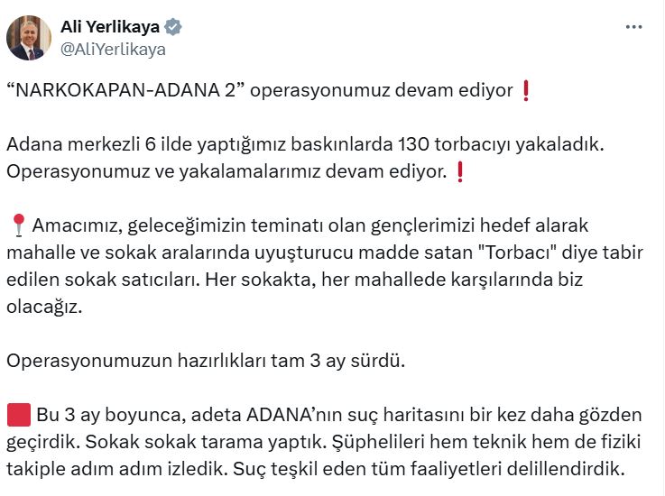 Bakan Yerlikayanın sosyal medya hesabından yaptığı açıklamaya göre; Adana merkezli İstanbul, Konya, Adıyaman, Samsun ve Kayseride uyuşturucu satıcılarına yönelik Narkokapan-Adana 2 operasyonları düzenlendi. Polis tarafından yapılan operasyonlarda 130 torbacı yakalandı. Operasyonlar ve yakalamalar devam ediyor. Operasyonlar sonucu; 5 ruhsatsız tabanca, 4 ruhsatsız av tüfeği, 1 hassas terazi ve muhtelif miktarda uyuşturucu madde ele geçirildi.