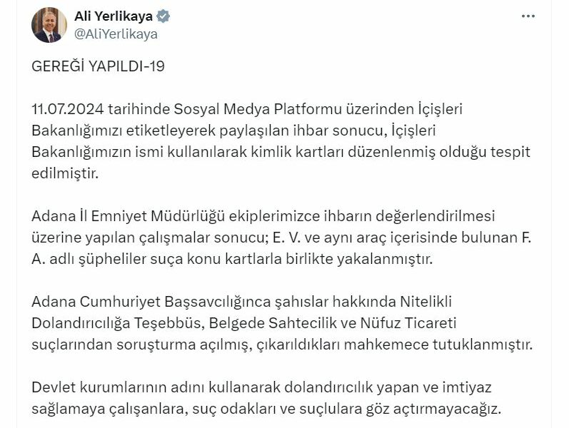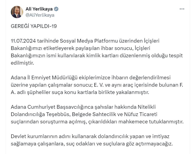Bakan Yerlikaya, sosyal medya hesabından yaptığı açıklamada, “11 Temmuz 2024 tarihinde sosyal medya platformu üzerinden İçişleri Bakanlığımızı etiketleyerek paylaşılan ihbar sonucu, İçişleri Bakanlığımızın ismi kullanılarak kimlik kartları düzenlenmiş olduğu tespit edilmiştir. Adana İl Emniyet Müdürlüğü ekiplerimizce ihbarın değerlendirilmesi üzerine yapılan çalışmalar sonucu; E.V. ve aynı araç içerisinde bulunan F.A. adlı şüpheliler suça konu kartlarla birlikte yakalanmıştır. Adana Cumhuriyet Başsavcılığınca şahıslar hakkında nitelikli dolandırıcılığa teşebbüs, belgede sahtecilik ve nüfuz ticareti suçlarından soruşturma açılmış, çıkarıldıkları mahkemece tutuklanmıştır. Devlet kurumlarının adını kullanarak dolandırıcılık yapan ve imtiyaz sağlamaya çalışanlara, suç odakları ve suçlulara göz açtırmayacağız” dedi.