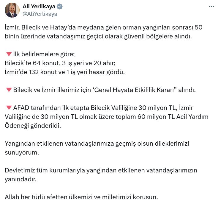Bakan Yerlikaya, sosyal medya hesabından yaptığı açıklamada, “İzmir, Bilecik ve Hatayda meydana gelen orman yangınları sonrası 50 binin üzerinde vatandaşımız geçici olarak güvenli bölgelere alındı. İlk belirlemelere göre; Bilecik’te 64 konut, 3 iş yeri ve 20 ahır; İzmir’de 132 konut ve 1 iş yeri hasar gördü. Bilecik ve İzmir illerimiz için Genel Hayata Etkililik Kararı alındı. AFAD tarafından ilk etapta Bilecik Valiliğine 30 milyon TL, İzmir Valiliğine de 30 milyon TL olmak üzere toplam 60 milyon TL acil yardım ödeneği gönderildi. Yangından etkilenen vatandaşlarımıza geçmiş olsun dileklerimizi sunuyorum. Devletimiz tüm kurumlarıyla yangından etkilenen vatandaşlarımızın yanındadır. Allah her türlü afetten ülkemizi ve milletimizi korusun” dedi.