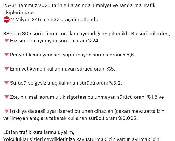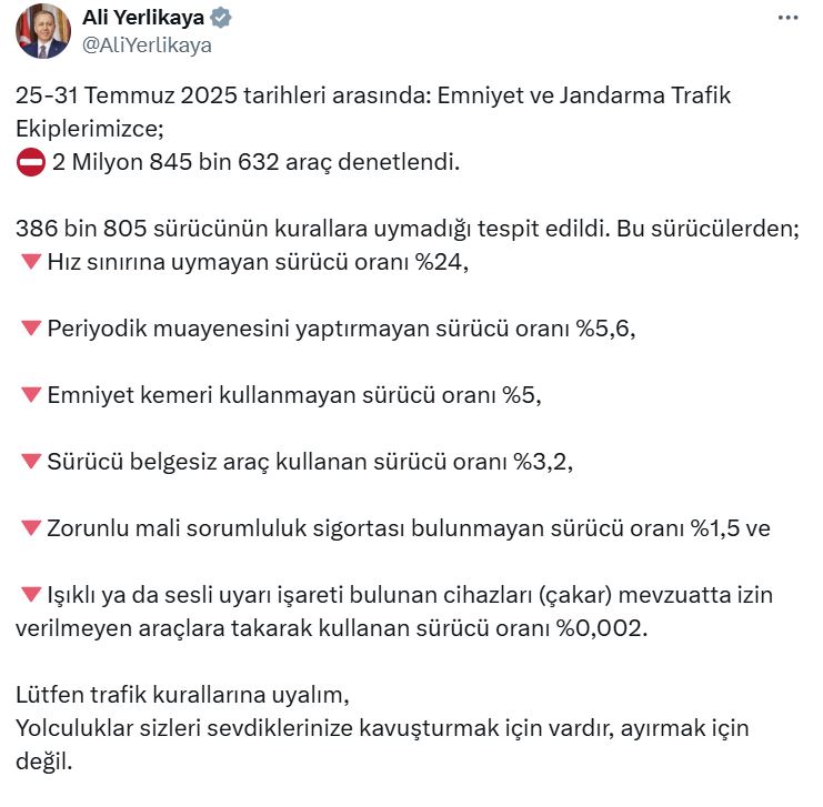 Bakan Yerlikaya, sosyal medya hesabından yaptığı açıklamada, “25-31 Temmuz 2025 tarihleri arasında, emniyet ve jandarma trafik ekiplerimizce; 2 milyon 845 bin 632 araç denetlendi. 386 bin 805 sürücünün kurallara uymadığı tespit edildi. Bu sürücülerden; hız sınırına uymayan sürücü oranı yüzde 24, periyodik muayenesini yaptırmayan sürücü oranı yüzde 5,6, emniyet kemeri kullanmayan sürücü oranı yüzde 5, sürücü belgesiz araç kullanan sürücü oranı yüzde 3,2, zorunlu mali sorumluluk sigortası bulunmayan sürücü oranı yüzde 1,5 ve ışıklı ya da sesli uyarı işareti bulunan cihazları (çakar) mevzuatta izin verilmeyen araçlara takarak kullanan sürücü oranı yüzde 0,002. Lütfen trafik kurallarına uyalım. Yolculuklar sizleri sevdiklerinize kavuşturmak için vardır, ayırmak için değil” dedi.