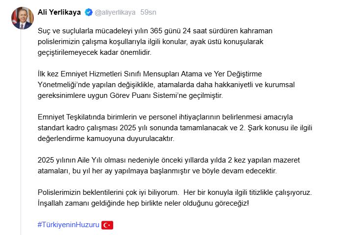 İçişleri Bakanı Ali Yerlikaya, polis atama ve yer değiştirme işlemleri ile ilgili NSosyal hesabından açıklama yaptı. Bakan Yerlikaya, “Suç ve suçlularla mücadeleyi yılın 365 günü 24 saat sürdüren kahraman polislerimizin çalışma koşullarıyla ilgili konular, ayaküstü konuşularak geçiştirilemeyecek kadar önemlidir. İlk kez Emniyet Hizmetleri Sınıfı Mensupları Atama ve Yer Değiştirme Yönetmeliğinde yapılan değişiklikle, atamalarda daha hakkaniyetli ve kurumsal gereksinimlere uygun Görev Puanı Sistemine geçilmiştir. Emniyet teşkilatında birimlerin ve personel ihtiyaçlarının belirlenmesi amacıyla standart kadro çalışması 2025 yılı sonunda tamamlanacak ve 2nci şark konusu ile ilgili değerlendirme kamuoyuna duyurulacaktır. 2025 yılının Aile Yılı olması nedeniyle önceki yıllarda yılda 2 kez yapılan mazeret atamaları, bu yıl her ay yapılmaya başlanmıştır ve böyle devam edecektir. Polislerimizin beklentilerini çok iyi biliyorum. Her bir konuyla ilgili titizlikle çalışıyoruz. İnşallah zamanı geldiğinde hep birlikte neler olduğunu göreceğiz” dedi.