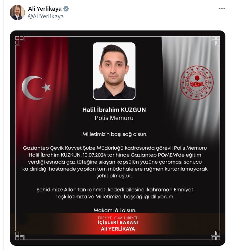 Bakan Yerlikaya, sosyal medya hesabından yaptığı açıklamada, “Milletimizin başı sağ olsun. Gaziantep Çevik Kuvvet Şube Müdürlüğü kadrosunda görevli polis memuru Halil İbrahim Kuzgun, 10 Temmuz 2024 tarihinde Gaziantep POMEMde eğitim verdiği esnada gaz tüfeğine sıkışan kapsülün yüzüne çarpması sonucu kaldırıldığı hastanede yapılan tüm müdahalelere rağmen kurtarılamayarak şehit olmuştur. Şehidimize Allahtan rahmet; kederli ailesine, kahraman emniyet teşkilatımıza ve milletimize başsağlığı diliyorum. Makamı ali olsun” dedi.