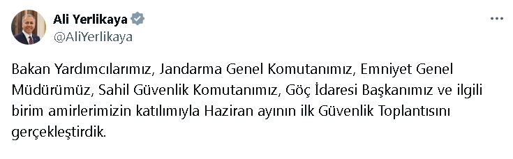 Bakan Yerlikaya, sosyal medya hesabından yaptığı açıklamada, “Bakan Yardımcılarımız, Jandarma Genel Komutanımız, Emniyet Genel Müdürümüz, Sahil Güvenlik Komutanımız, Göç İdaresi Başkanımız ve ilgili birim amirlerimizin katılımıyla haziran ayının ilk Güvenlik Toplantısını gerçekleştirdik. Toplantıda; başta terör olmak üzere organize suç örgütleri, uyuşturucu, asayiş, yakalamalar, trafik ve göçmen kaçakçılığı organizatörleriyle mücadele ana gündem maddelerimizdi. 9 günlük Kurban Bayramı tatili nedeniyle yollarımızda oluşacak yoğunluk, alınacak önlemler ve trafik kurallarına riayet büyük önem arz ediyor. Terör örgütleri ve iş birlikçileriyle, organize suç örgütleriyle, zehir tacirleriyle, şehir eşkıyalarıyla ve tüm suç odaklarıyla mücadelemizi de aralıksız sürdürüyoruz. Yaz kış demeden yılın 365 günü görev yapan kahraman güvenlik güçlerimize teşekkür ediyor, görevlerinde üstün başarılar diliyorum” dedi.