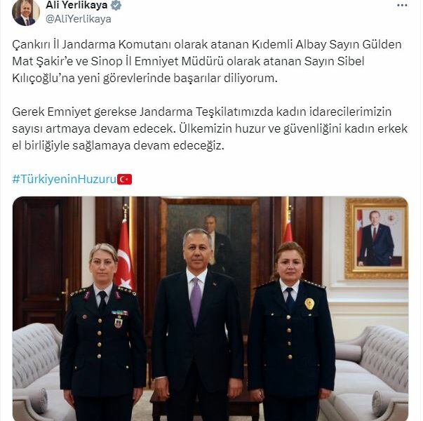 Bakan Yerlikaya, sosyal medya hesabından yaptığı açıklamada, “Çankırı İl Jandarma Komutanı olarak atanan Kıdemli Albay Sayın Gülden Mat Şakire ve Sinop İl Emniyet Müdürü olarak atanan Sayın Sibel Kılıçoğluna yeni görevlerinde başarılar diliyorum. Gerek emniyet gerekse jandarma teşkilatımızda kadın idarecilerimizin sayısı artmaya devam edecek. Ülkemizin huzur ve güvenliğini kadın erkek el birliğiyle sağlamaya devam edeceğiz” ifadelerini kullandı.