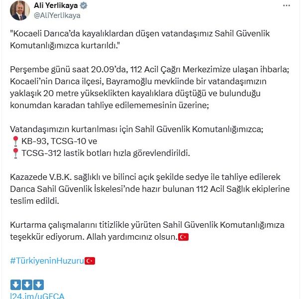 İçişleri Bakanı Ali Yerlikaya, V.B.K.nin kurtarılma anlarına ilişkin görüntüleri paylaşarak, “Perşembe günü saat 20.09da, 112 Acil Çağrı Merkezimize ulaşan ihbarla; Kocaelinin Darıca ilçesi, Bayramoğlu mevkisinde bir vatandaşımızın yaklaşık 20 metre yükseklikten kayalıklara düştüğü ve bulunduğu konumdan karadan tahliye edilememesi üzerine; Sahil Güvenlik Komutanlığımızca KB-93, TCSG-10 ve TCSG-312 lastik botları hızla görevlendirildi. Kazazede V.B.K. sağlıklı ve bilinci açık şekilde sedye ile tahliye edilerek Darıca Sahil Güvenlik İskelesinde hazır bulunan 112 Acil Sağlık ekiplerine teslim edildi. Kurtarma çalışmalarını titizlikle yürüten Sahil Güvenlik Komutanlığımıza teşekkür ediyorum. Allah yardımcınız olsun” ifadelerini kullandı.