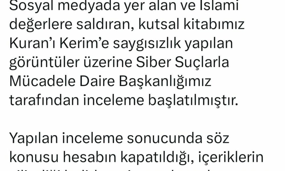 İçişleri Bakanı Ali Bakan Yerlikaya, sosyal medya hesabından yaptığı açıklamada, sosyal medyada yer alan, İslami değerlere saldıran ve Kuran-ı Kerime saygısızlık yapılan görüntüler üzerine Siber Suçlarla Mücadele Daire Başkanlığı tarafından inceleme başlatıldığını belirtti. Yapılan inceleme sonucunda söz konusu hesabın kapatıldığı ve içeriklerin silindiğinin belirlendiğini aktaran Yerlikaya, “Paylaşımları yapan şahsın 23 yaşındaki M.Ç. olduğu tespit edilmiştir. Şahıs, Adana Seyhanda yakalanarak gözaltına alınmıştır. Şahısla ilgili Cumhuriyet Savcılığımızca Halkı kin ve düşmanlığa tahrik veya aşağılama suçundan tahkikat başlatılmıştır. Yüce kitabımız Kuran-ı Kerime yönelik hakaret içerikli paylaşımları lanetliyorum. Milli ve manevi değerlerimizi aşağılamaya çalışan, nefret söylemleriyle halkımızı kin ve düşmanlığa tahrik edenler yüce Türk adaleti önünde hesap verecektir” dedi.