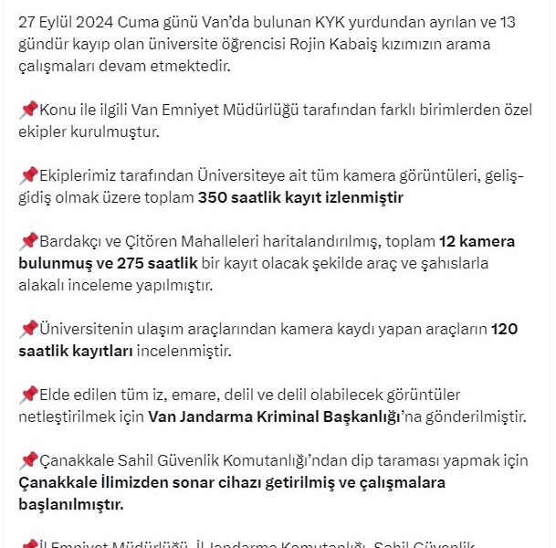 Yerlikaya, 13 gündük kayıp olan Rojin Kabaişi arama çalışmalarının sürdüğünü belirterek, “Konu ile ilgili Van Emniyet Müdürlüğü tarafından farklı birimlerden özel ekipler kurulmuştur. Ekiplerimiz tarafından üniversiteye ait tüm kamera görüntüleri, geliş- gidiş olmak üzere toplam 350 saatlik kayıt izlenmiştir. Bardakçı ve Çitören mahalleleri haritalandırılmış, toplam 12 kamera bulunmuş ve 275 saatlik bir kayıt olacak şekilde araç ve şahıslarla alakalı inceleme yapılmıştır. Üniversitenin ulaşım araçlarından kamera kaydı yapan araçların 120 saatlik kayıtları incelenmiştir. Elde edilen tüm iz, emare, delil ve delil olabilecek görüntüler netleştirilmek için Van Jandarma Kriminal Başkanlığı’na gönderilmiştir. Çanakkale Sahil Güvenlik Komutanlığı’ndan dip taraması yapmak için Çanakkale ilimizden sonar cihazı getirilmiş ve çalışmalara başlanılmıştır. İl Emniyet Müdürlüğü, İl Jandarma Komutanlığı, Sahil Güvenlik Komutanlığı, AFAD, itfaiye ve Kızılay olmak üzere dalgıç, arama köpekleri, drone, bot/ gemi, helikopter, itfaiye aracı, mobil radar cihazı ile 24 saat esaslı göl ve kara alanında çalışmalar yapmış; müştemilat, metruk alanlar, sazlık ve logar alanları 50 ekip ve 250 personel ile 24 saat esaslı incelenmektedir. Rojin kızımızı bulmak için arama çalışmalarımız 24 saat esasına göre aralıksız sürdürülmektedir” ifadelerini kullandı.