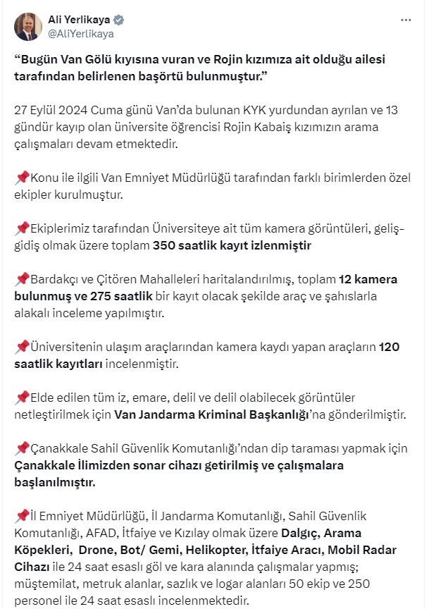 Bakan Yerlikaya, sosyal medya hesabından, 27 Eylülde Vanda Kredi ve Yurtlar Kurumu yurdundan ayrıldıktan sonra kaybolan Rojin Kabaişi arama çalışmalarına ilişkin açıklama yaptı. Bakan Yerlikaya, “Bugün Van Gölü kıyısına vuran ve Rojin kızımıza ait olduğu ailesi tarafından belirlenen başörtü bulunmuştur” dedi.