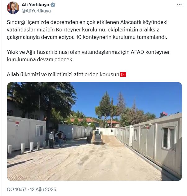 İçişleri Bakanı Ali Yerlikaya, sosyal medya hesabından yaptığı açıklamada, “Sındırgı ilçemizde depremden en çok etkilenen Alacaatlı köyündeki vatandaşlarımız için konteyner kurulumu, ekiplerimizin aralıksız çalışmalarıyla devam ediyor. 10 konteynerin kurulumu tamamlandı. Yıkık ve ağır hasarlı binası olan vatandaşlarımız için AFAD konteyner kurulumuna devam edecek. Allah ülkemizi ve milletimizi afetlerden korusun” ifadelerini kullandı.