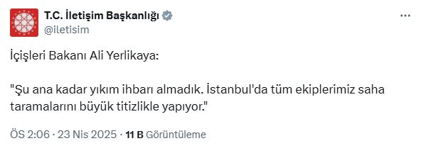 İletişim Başkanlığının sosyal medya hesabından, İçişleri Bakanı Ali Yerlikayanın İstanbuldaki 6.2lik depreme ilişkin açıklaması paylaşıldı. Bakan Yerlikaya, “Şu ana kadar yıkım ihbarı almadık. İstanbulda tüm ekiplerimiz saha taramalarını büyük titizlikle yapıyor” dedi.