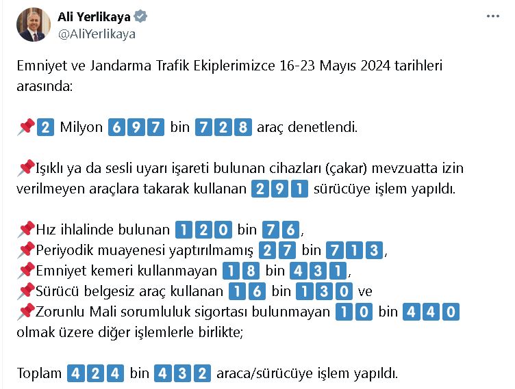 Bakan Yerlikaya, sosyal medya hesabından yaptığı açıklamada, “Emniyet ve jandarma trafik ekiplerimizce 16-23 Mayıs 2024 tarihleri arasında 2 milyon 697 bin 728 araç denetlendi. Işıklı ya da sesli uyarı işareti bulunan cihazları (çakar) mevzuatta izin verilmeyen araçlara takarak kullanan 291 sürücüye işlem yapıldı. Hız ihlalinde bulunan 120 bin 76, periyodik muayenesi yaptırılmamış 27 bin 713, emniyet kemeri kullanmayan 18 bin 431, sürücü belgesiz araç kullanan 16 bin 130 ve zorunlu mali sorumluluk sigortası bulunmayan 10 bin 440 olmak üzere diğer işlemlerle birlikte; toplam 424 bin 432 araca/sürücüye işlem yapıldı” ifadelerini kullandı.