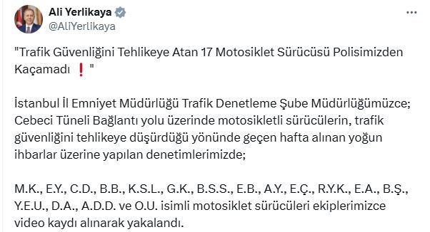 İçişleri Bakanı Ali Yerlikaya, İstanbul Emniyet Müdürlüğü Trafik Denetleme Şube ekiplerince trafik güvenliğini tehlikeye düşüren motosiklet sürücülerine yönelik yürütülen çalışmayı sosyal medya hesabından paylaştı. Buna göre; Cebeci Tüneli bağlantı yolu üzerinde motosikletli sürücülerin, trafik güvenliğini tehlikeye düşürdüğü yönünde geçen hafta alınan yoğun ihbarlar üzerine söz konusu bölgede denetim gerçekleştirildi. 17 motosiklet sürücüsü yakalanırken, kaçmaya çalışan sürücüler ile polis ekipleri arasındaki takip kameralara yansıdı.