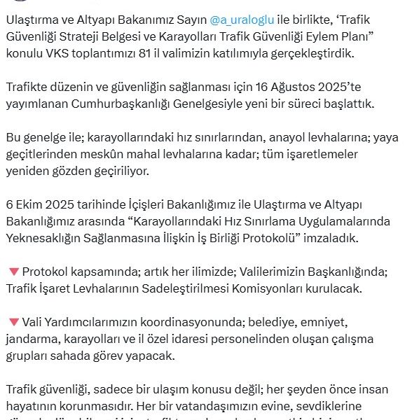İçişleri Bakanı Ali Yerlikaya ile Ulaştırma ve Altyapı Bakanı Abdulkadir Uraloğlu, 81 ilin valisi ile Trafik Güvenliği Strateji Belgesi ve Karayolları Trafik Güvenliği Eylem Planı konulu video konferans toplantısı gerçekleştirdi. Bakan Yerlikaya, sosyal medya hesabından yaptığı açıklamada, “Trafikte düzenin ve güvenliğin sağlanması için 16 Ağustos 2025te yayımlanan Cumhurbaşkanlığı genelgesiyle yeni bir süreci başlattık. Bu genelge ile kara yollarındaki hız sınırlarından anayol levhalarına, yaya geçitlerinden meskun mahal levhalarına kadar tüm işaretlemeler yeniden gözden geçiriliyor. 6 Ekim 2025 tarihinde İçişleri Bakanlığımız ile Ulaştırma ve Altyapı Bakanlığımız arasında Karayollarındaki Hız Sınırlama Uygulamalarında Yeknesaklığın Sağlanmasına İlişkin İş Birliği Protokolü imzaladık. Protokol kapsamında; artık her ilimizde valilerimizin başkanlığında Trafik İşaret Levhalarının Sadeleştirilmesi Komisyonları kurulacak. Vali yardımcılarımızın koordinasyonunda; belediye, emniyet, jandarma, karayolları ve il özel idaresi personelinden oluşan çalışma grupları sahada görev yapacak. Trafik güvenliği, sadece bir ulaşım konusu değil; her şeyden önce insan hayatının korunmasıdır. Her bir vatandaşımızın evine, sevdiklerine güvenle dönebilmesi için trafikte sade, anlaşılır ve etkin bir işaretleme sistemi hedefiyle yeni bir dönüşüm sürecini yürütüyoruz” dedi.