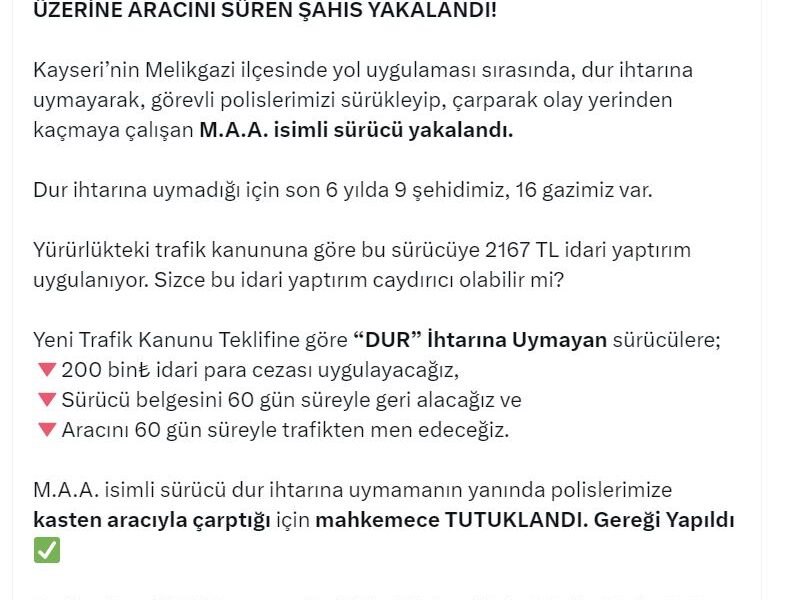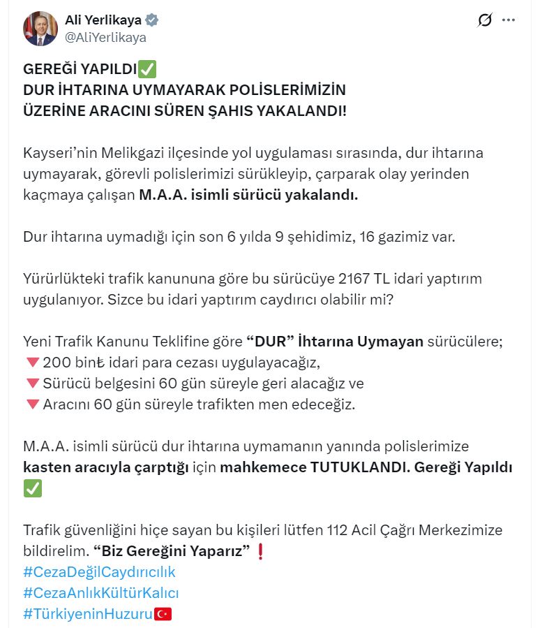 Bakan Ali Yerlikaya, Kayseride polise çarpıp kaçan sürücünün görüntülerini sosyal medya hesabından paylaşarak, “Kayseri’nin Melikgazi ilçesinde yol uygulaması sırasında, Dur ihtarına uymayarak, görevli polislerimizi sürükleyip, çarparak olay yerinden kaçmaya çalışan M.A.A. isimli sürücü yakalandı. M.A.A. isimli sürücü Dur ihtarına uymamanın yanında polislerimize kasten aracıyla çarptığı için mahkemece tutuklandı. Trafik güvenliğini hiçe sayan bu kişileri lütfen 112 Acil Çağrı Merkezimize bildirelim. Biz gereğini yaparız” dedi.
